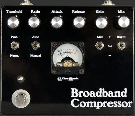 The Broadband Compressor puts all of the power in the user’s hands with auto or manual attack/release, threshold, ratio, make up gain, a dry mix control, tonal compensation for the compression path and a VU meter to monitor gain reduction. For those “responsible enough”, the Broadband Compressor is the pedal you’ve been waiting for. Compress to your heart’s desire!